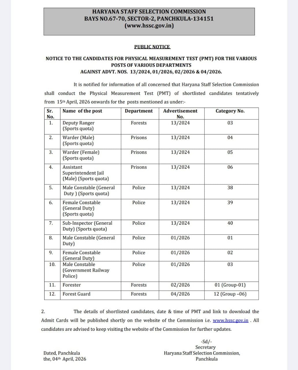 | PMT / PST Admit Card | 15 April 2026 |